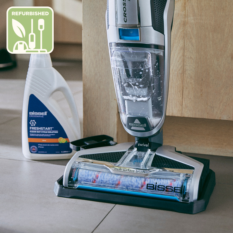reservoirtechnologie schoon en vuil water gescheiden. Met de Refurbished CrossWave® C3 weet u dus zeker dat u uw vloer altijd met schoon water schoonmaakt. Het FreshStart™-geurbeheersysteem zorgt ervoor dat de antimicrobiële borstelrol en filter voortdurend geurtjes voorkomen en frisheid behouden. Natural Multi-Surface Pet-reinigingsoplossing (1 l.) verwijdert geurtjes van huisdieren en zorgt voor een frisse geur in uw huis. Als u klaar bent met het schoonmaken van de vloer zet u de zelfreinigende cyclus aan. Deze reinigt niet alleen de borstelrol, maar ook de binnenkant van het apparaat. U hoeft dus na het schoonmaken van de vloer niet ook nog eens het apparaat schoon te maken.