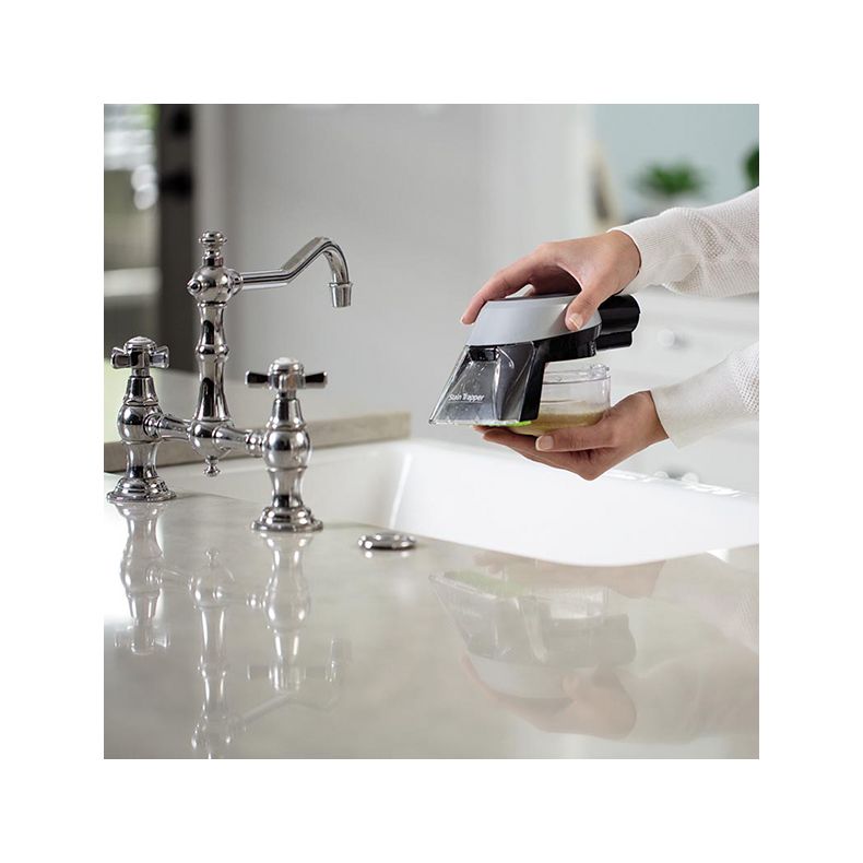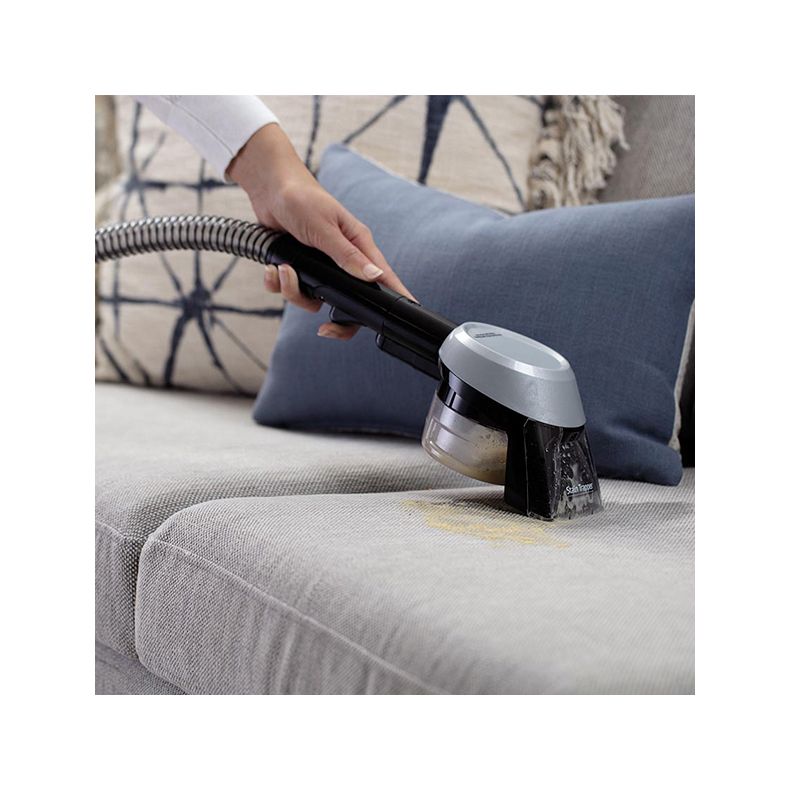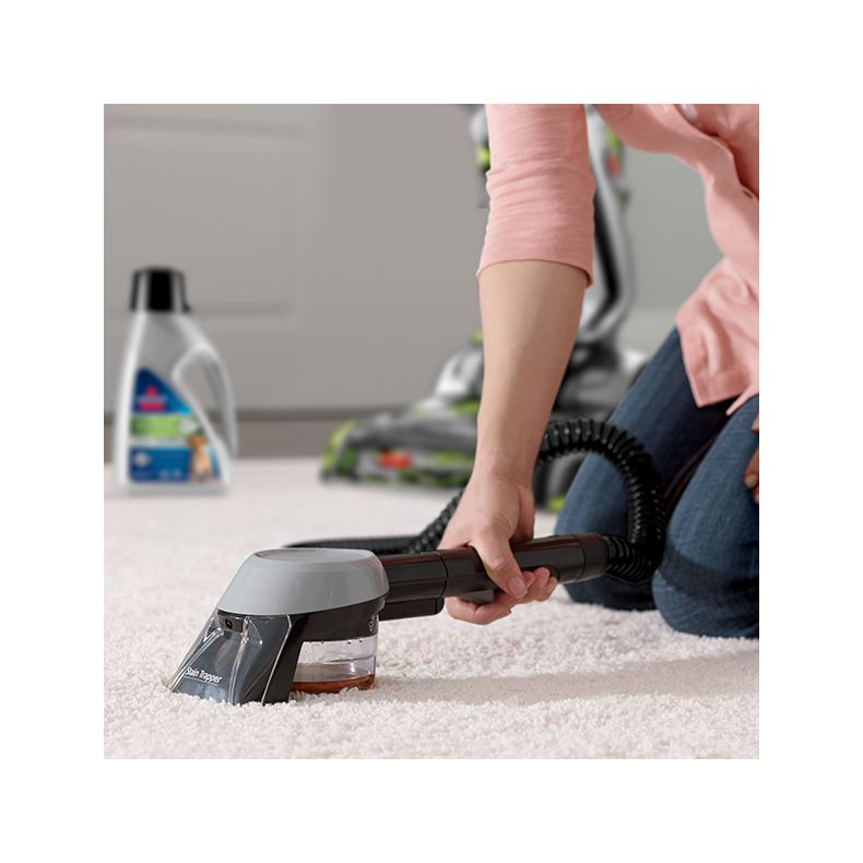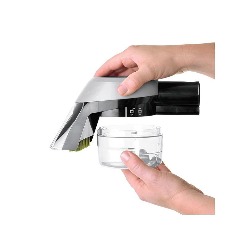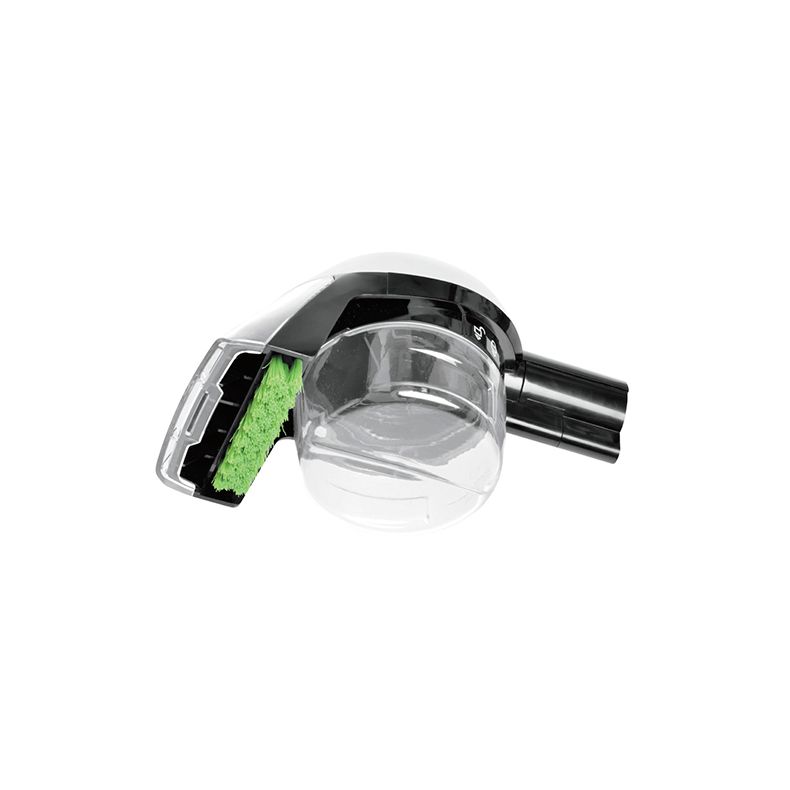 Plaats het accessoire recht op de vlek die u wilt verwijderen en activeer de trekker om een mengsel van de formule en water op de vlek te spuiten. Laat de trekker los en schrob voorzichtig met de borstel over de vlek om deze helemaal te verwijderen. Dit accessoire ruimt opgeruimd vuil op in een interne, gescheiden en verwijderbare afvalbak. Zo kunt u vuil gemakkelijk verwijderen door alleen de afvalbak leeg te maken. Het vuil komt niet in de slang of machine, zodat deze schoon blijven.