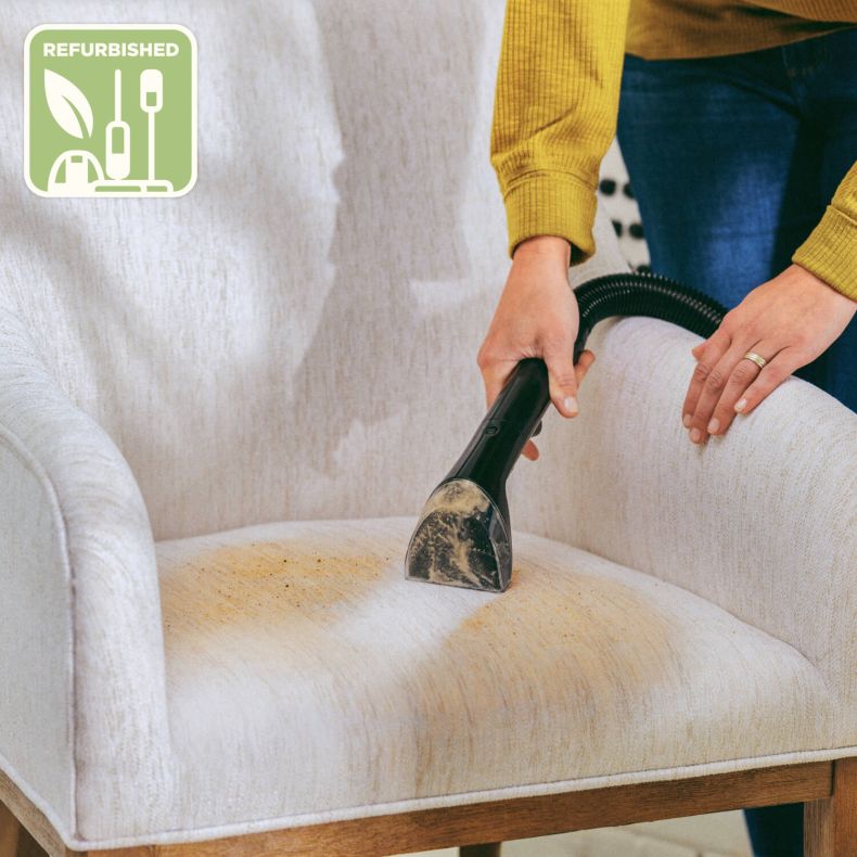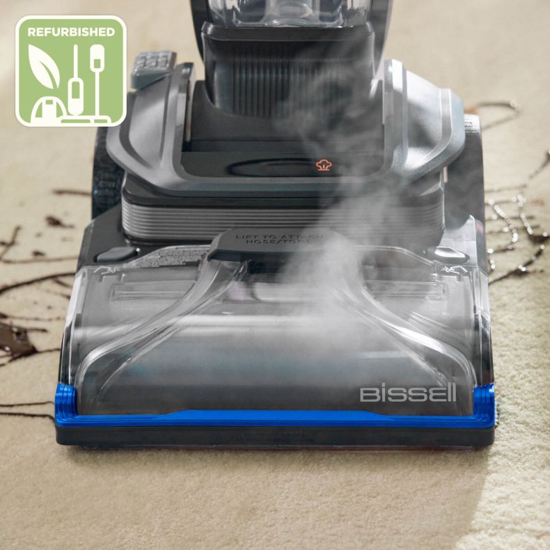De rechtopstaande tapijt- en bekledingsreiniger Refurbished Revolution™ HydroSteam™ is ontworpen om de hardnekkigste ingetrokken vlekken, plakkerige knoeiboel en hardnekkig vuil van tapijten en vloerkleden beter te verwijderen dankzij de kracht van de HydroSteam™-technologie. Wanneer gebruikt in de stoomvoorbehandelingsmodus of de SteamWash™ Max Clean-modus, dringt een combinatie van stoomdamp, water en speciaal samengestelde reinigingsoplossing van BISSELL® diep door in de stof, en de krachtige wrijving van twee Dirtlifter Powerborstels en een zuigkracht van 1300W zuigt het vuil rechtstreeks in het vuilewatertank, zodat het voorgoed verdwenen is. Een speciale sneldroogmodus reinigt en verfrist uw tapijten en vloerkleden en laat ze in slechts 30 minuten droog achter.* Voor het reinigen van moeilijk bereikbare oppervlakken zoals bekleding is er de mogelijkheid om de bijgeleverde slang met een Tough Stain Tool te bevestigen. U reinigt uw tapijten altijd met vers water dankzij de twee eenvoudig te vullen, te verwijderen en te reinigen tanks voor schoon en vuil water. Zijwaartse veegborstels zorgen ervoor dat u altijd efficiënt tegen plinten en rond meubels reinigt.